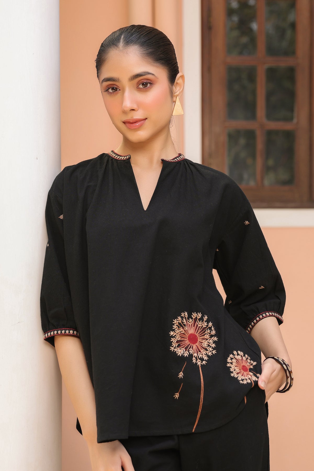 Black Cotton Embroidered Co-Ord Set featuring elegant embroidery on the neckline, front, and sleeves. The hip-length top comes with a mandarin collar and 3/4th Gathered sleeves with button closure for a refined look. Paired with matching black embroidered pants designed with an elastic waistband and two side pockets, this set offers all-day comfort and style—perfect for daily wear and office wear.