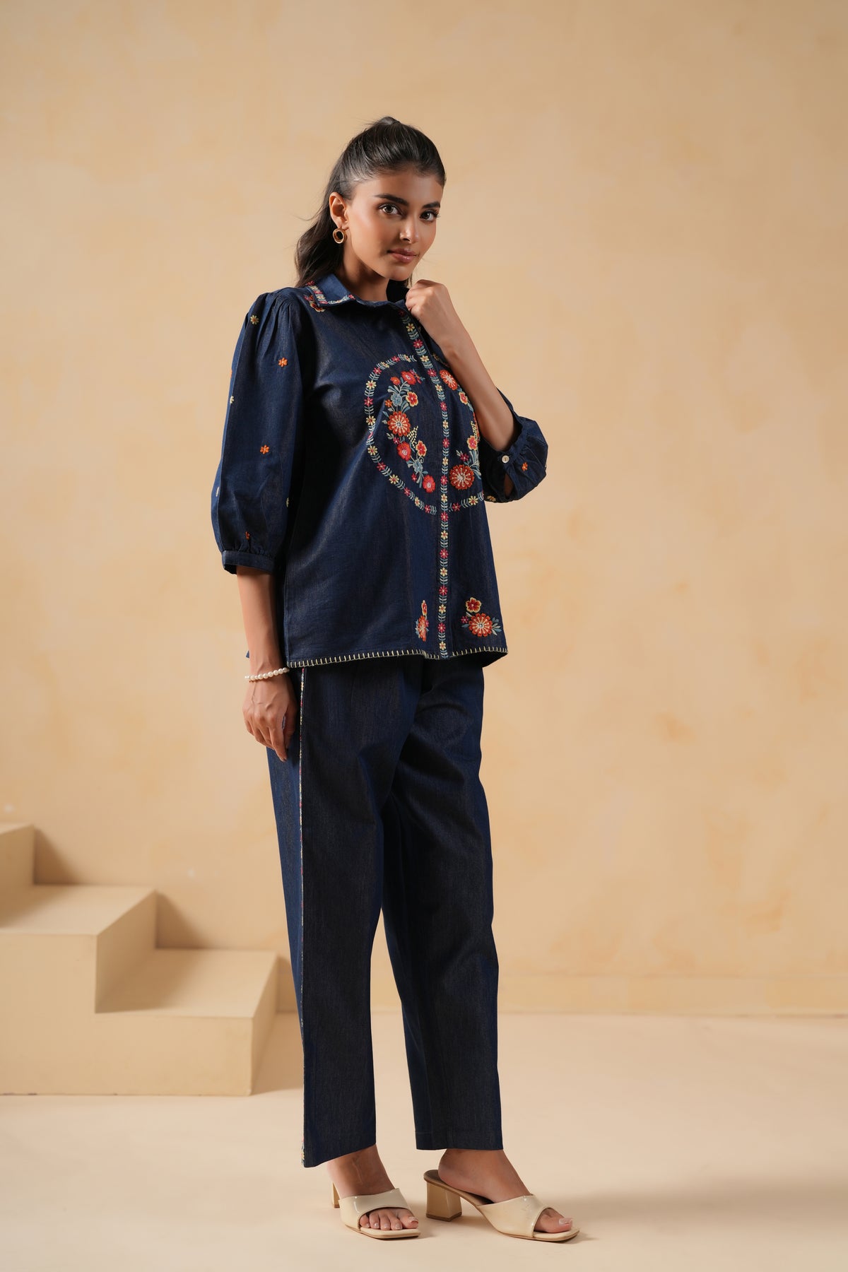 Elevate your style with this Blue Denim Embroidered Co-Ord Set, featuring intricate embroidery on the front, neckline, and sleeves, along with detailed thread work on the top hemline. The top comes with a stylish shirt collar, 3/4 puff button sleeves, and a front button closure for a chic look. The matching pants include elegant embroidery, an elastic waistband with drawstring, and convenient side pockets. Perfect for festive wear, family gatherings, and office wear, this co-Ord set blends comfort with contemporary charm.