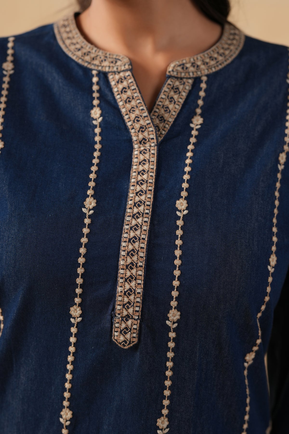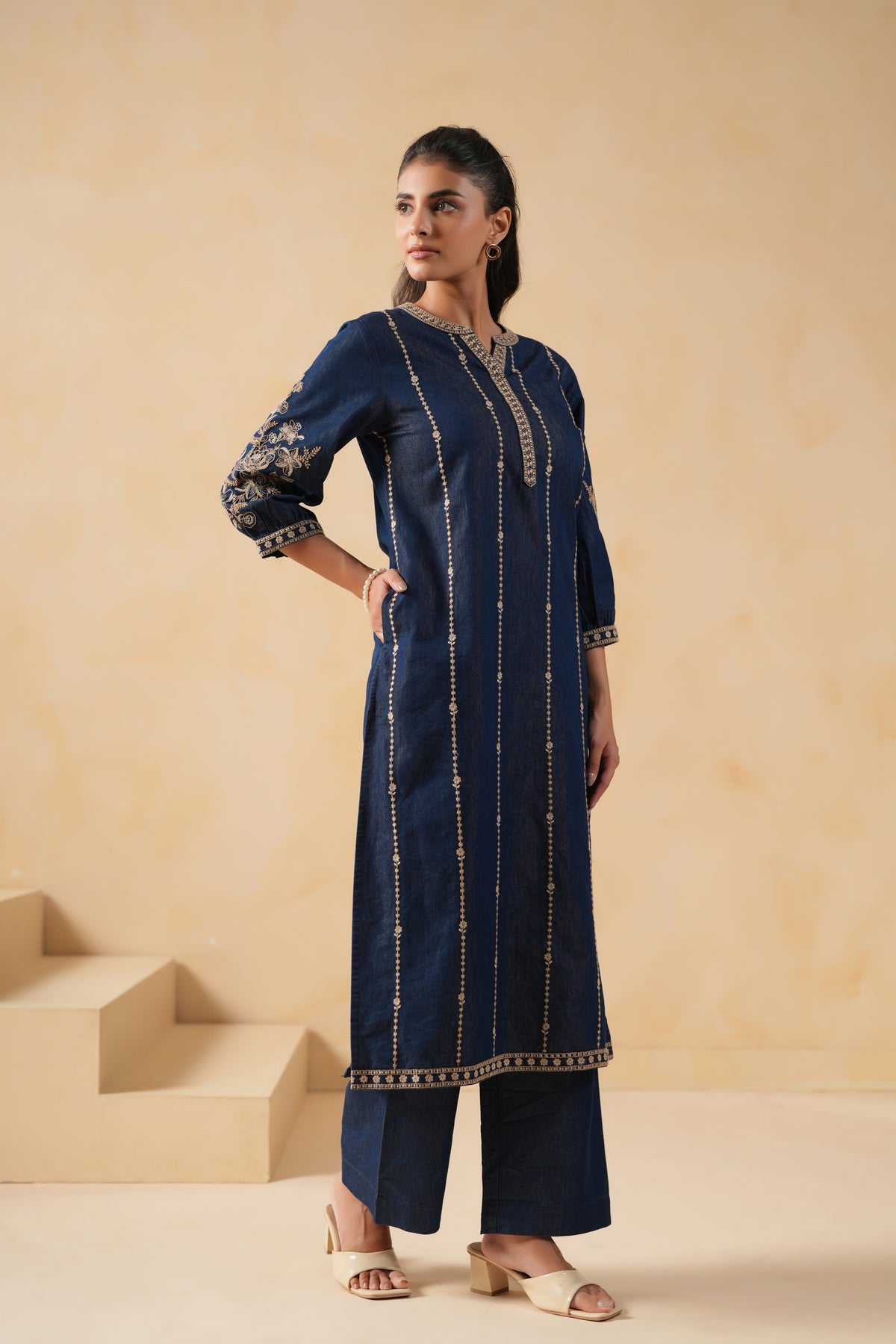 Dark Blue Denim Embroidered Designer Kurta featuring elegant embroidery on the front and sleeves for a refined look. Designed with a mandarin collar, 3/4 gathered sleeves with button detailing, and pintuck accents on the back, this calf-length kurta also includes side slits for ease of movement. Perfectly suited for office wear, casual outings, and family gatherings, it blends comfort with timeless style.