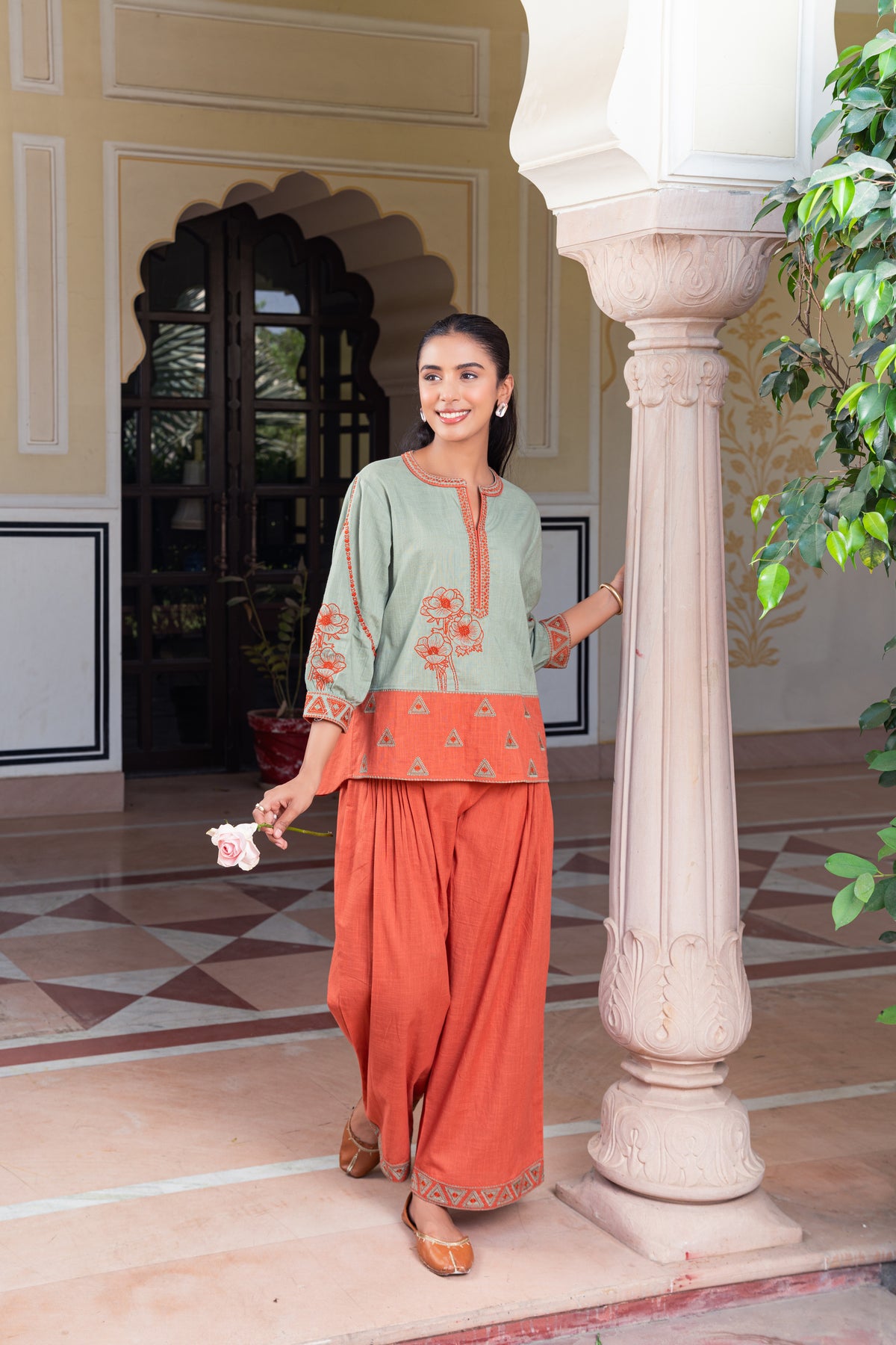 Green & Rust Cotton Embroidered Designer Co-Ord Set