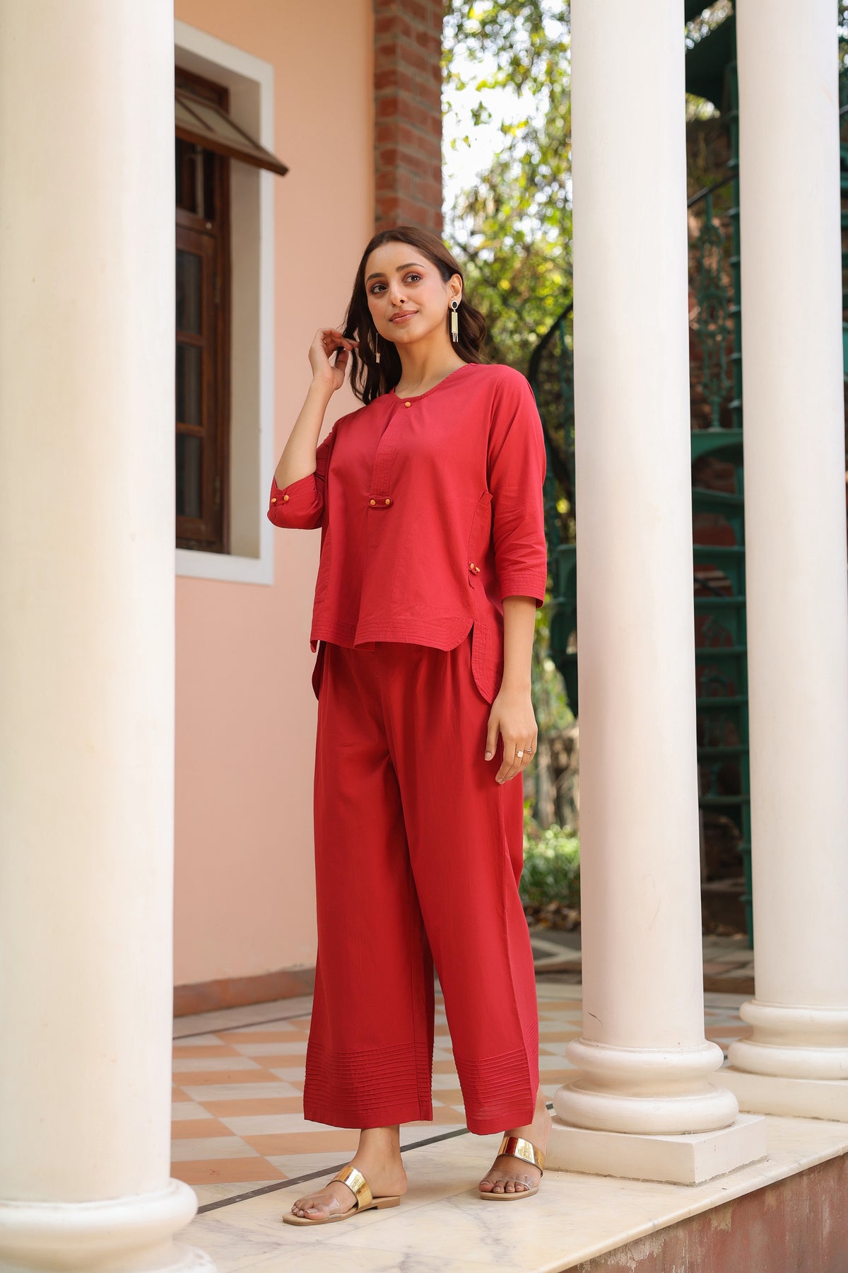 Red Cotton Detailed Co-Ord Set crafted for effortless everyday style. The top features a round neckline, 3/4 regular sleeves with potli button closure, and a front potli button placket. Designed with a stylish high-low hem, side pockets, and delicate tagai work on the front and hemline, it blends comfort with subtle detailing. Paired with matching red pants featuring pintuck detailing, a side pocket, and a semi-elastic waistband with drawstring, this co-ord set is ideal for daily wear and office wear.