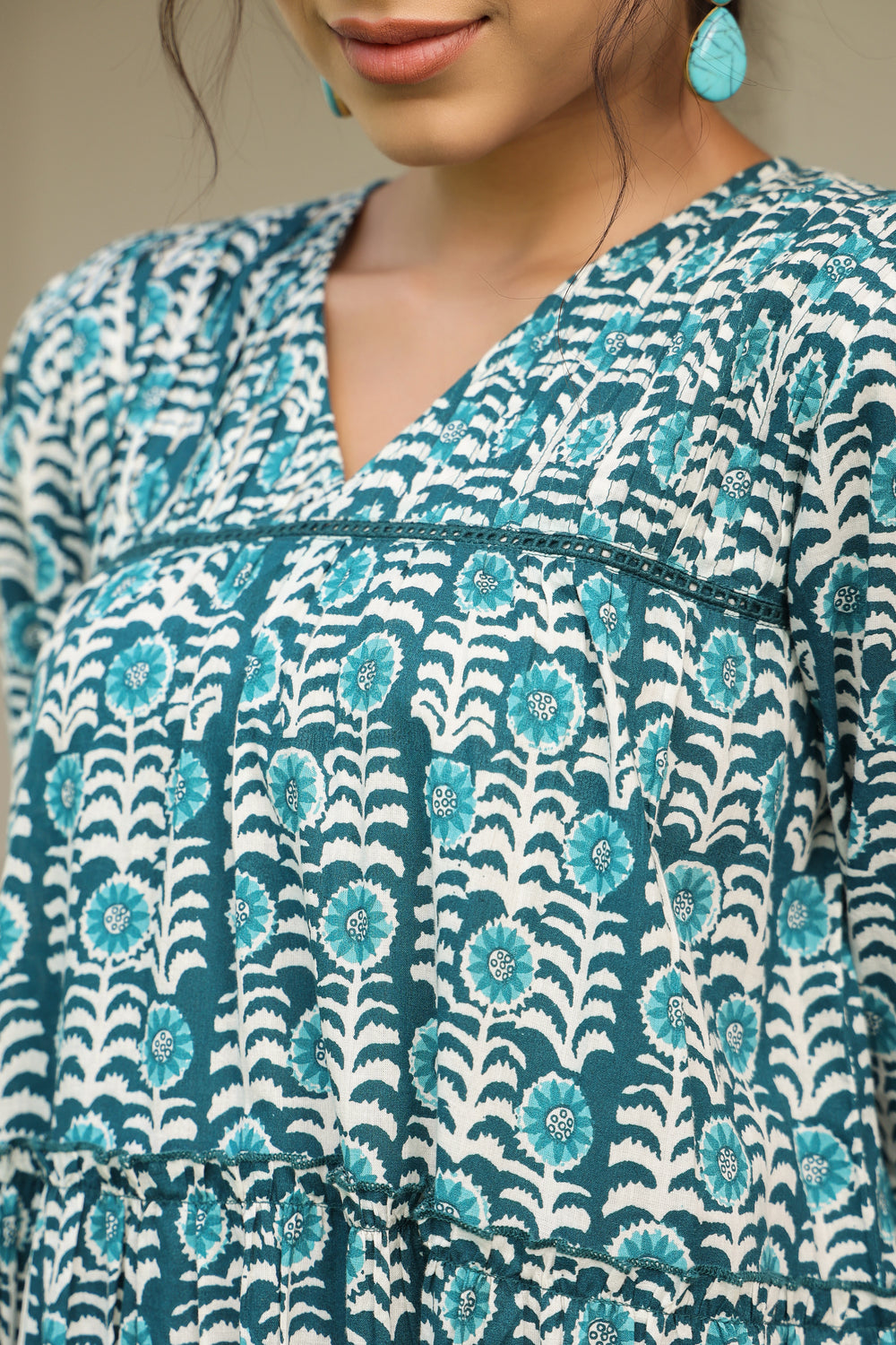 Blue Pure Cotton Floral Print Lace Work Tiered/Flared Designer Dress