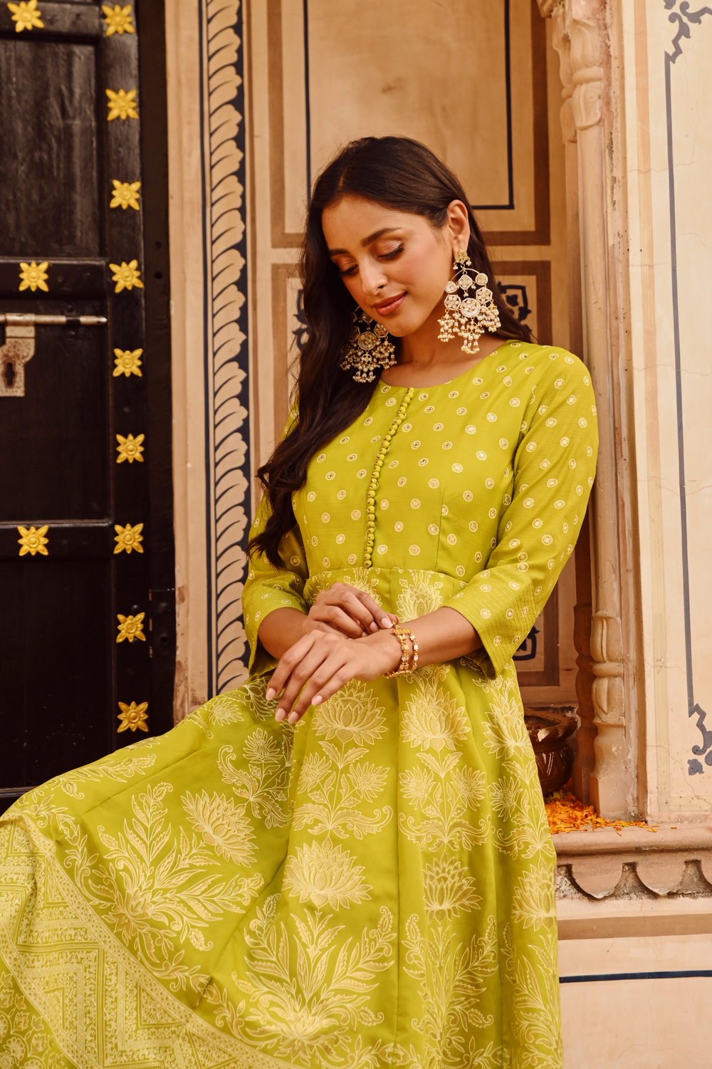 Elevate your festive wardrobe with this stunning Green Printed Flared Anarkali Dress. Designed in a regular fit, this cotton blend dress features a captivating foil print and intricate sequins and lace work on the yoke. The round neck and 3/4 sleeves add to its elegance, making it perfect for special occasions. Easy to care for with a gentle machine wash, this dress combines style and comfort seamlessly.