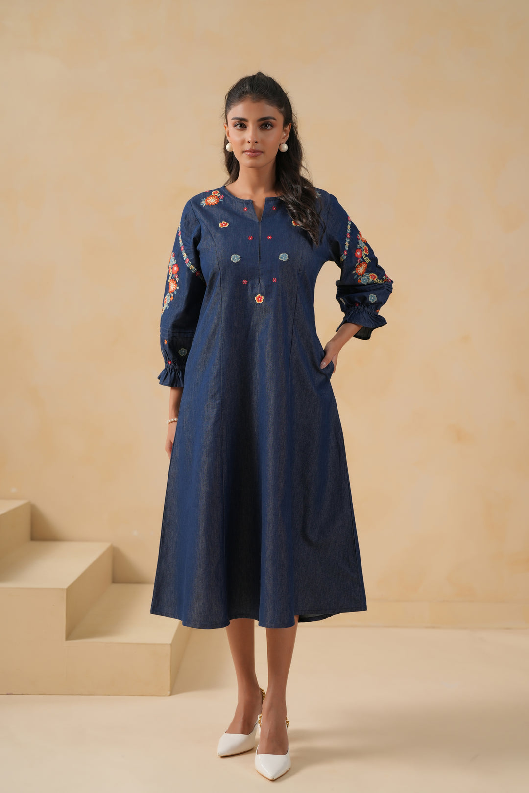 Dark Blue Cotton Denim Embroidered Shirt Collar Kurta