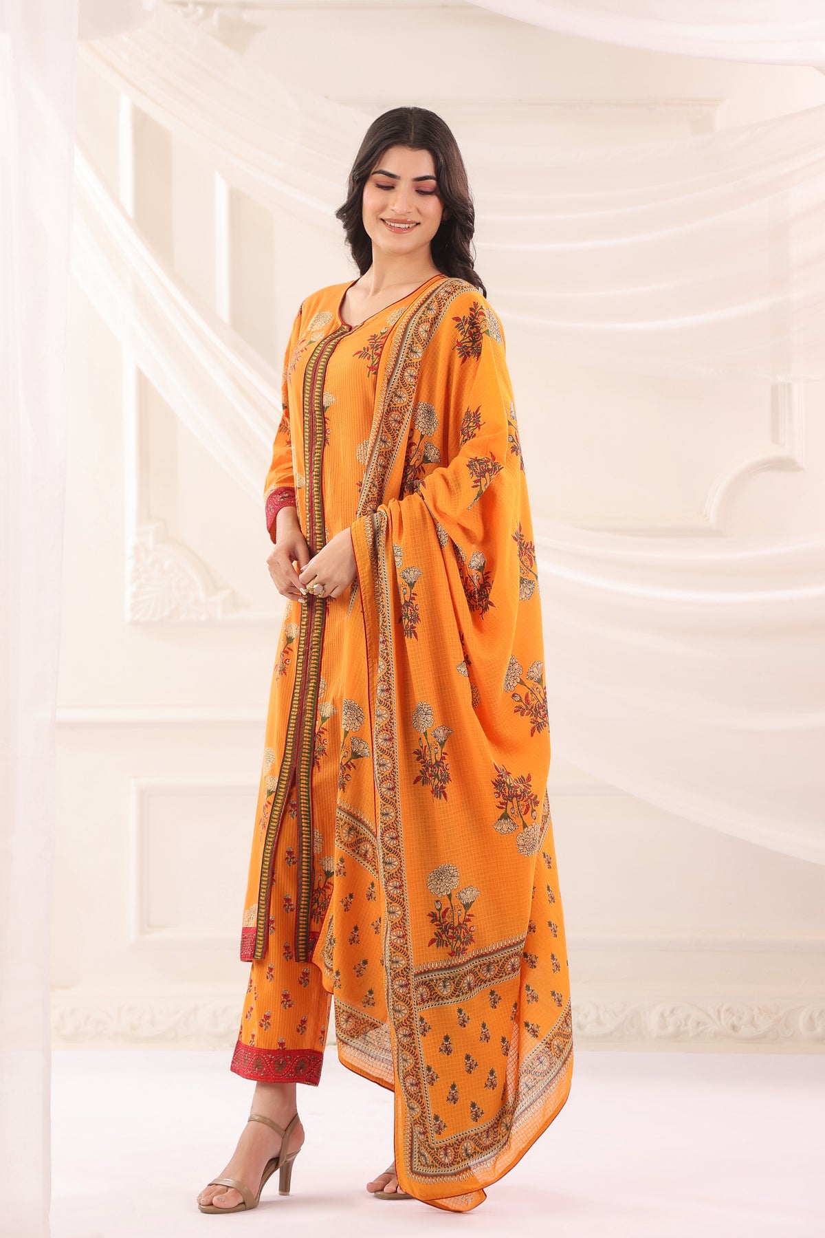 Add a graceful charm to your wardrobe with this Mustard Cotton Floral Printed Kurta Pant with Dupatta Set. The calf-length kurta features an all-over floral print, a round neck, and 3/4 regular sleeves, along with multiple slits and a convenient side pocket for added comfort. Paired with matching floral printed pants designed with an elastic waistband and side pockets, the set is completed with a beautifully printed dupatta finished with piping details. Perfect for festive occasions and party wear, this set blends elegance with everyday comfort.