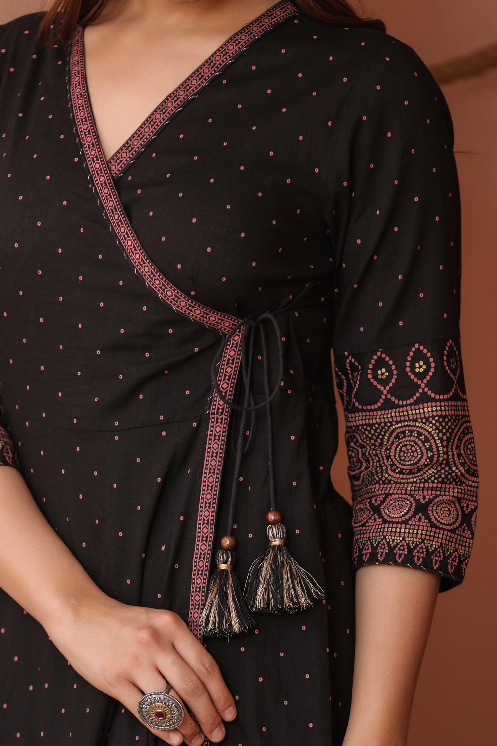 Elevate your style with our Black Cotton Printed Angrakha Kurta Pant Set, a perfect blend of elegance and comfort.