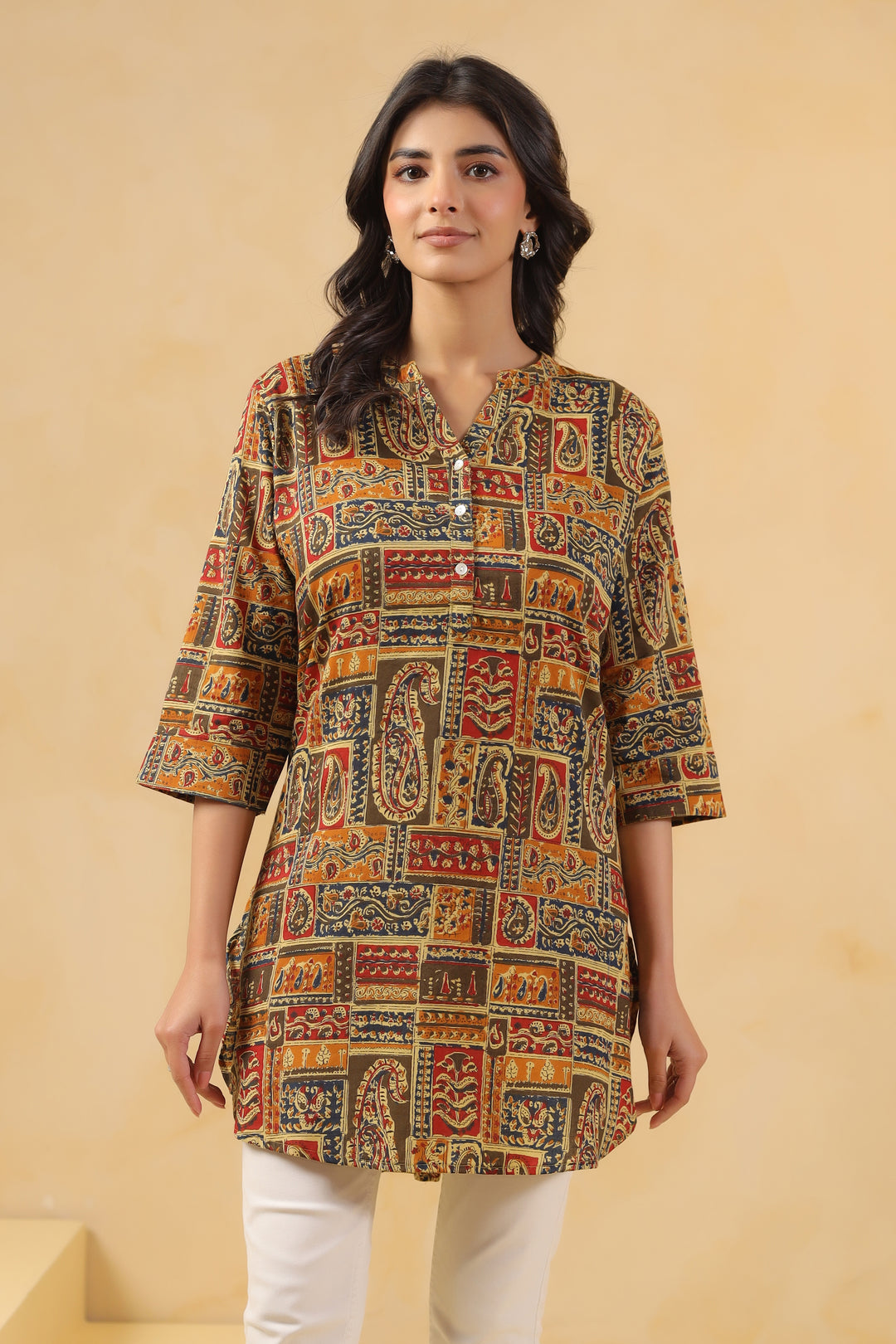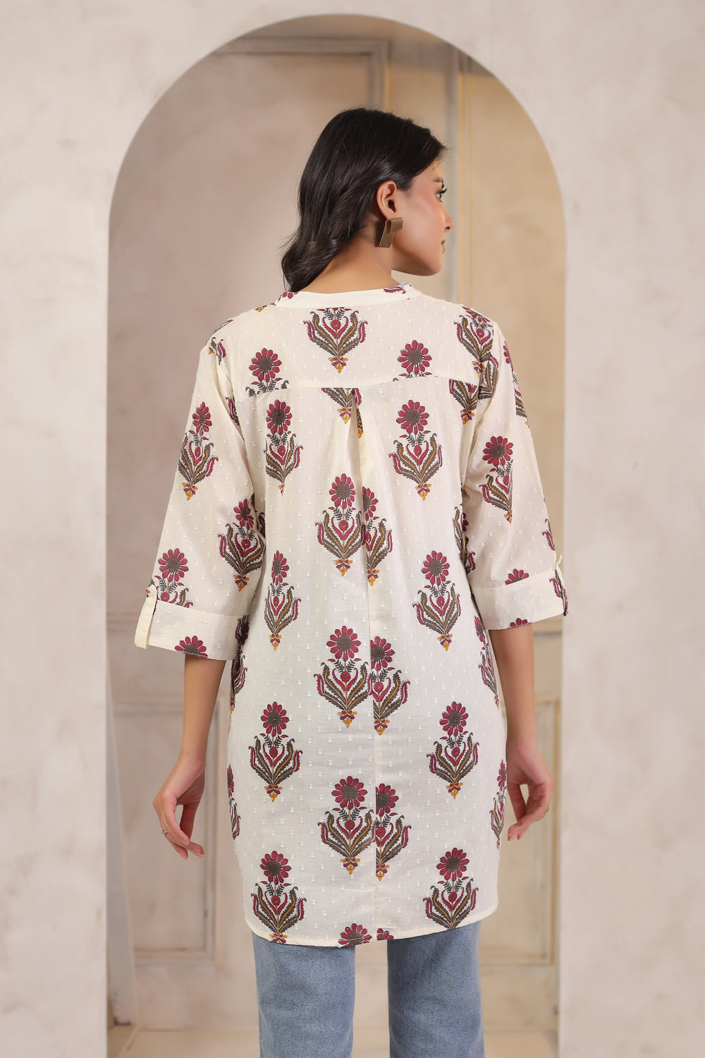 Beige & Red Cotton Embroidered Kurta Pant Set With Dupatta