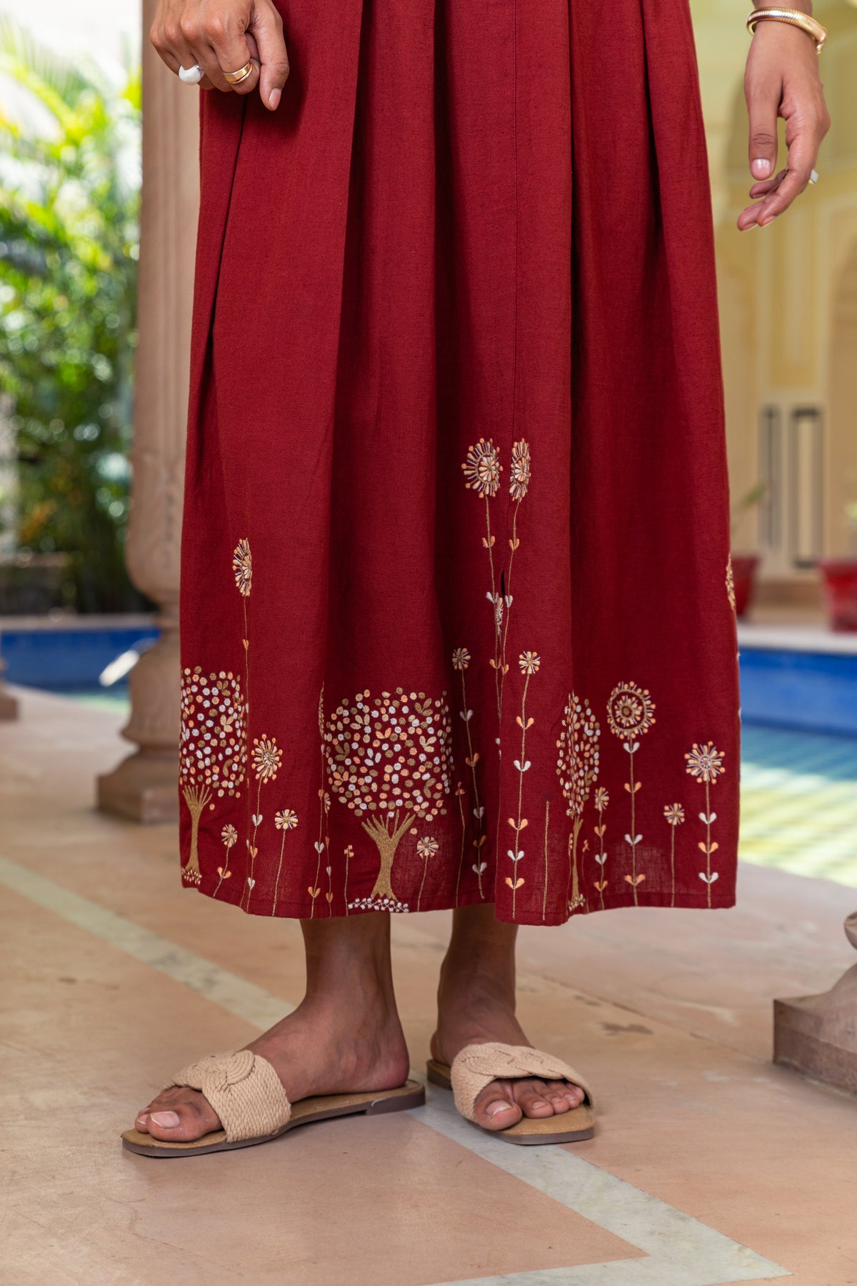Beige & Maroon Cotton Embroidered Designer Co-ord Set