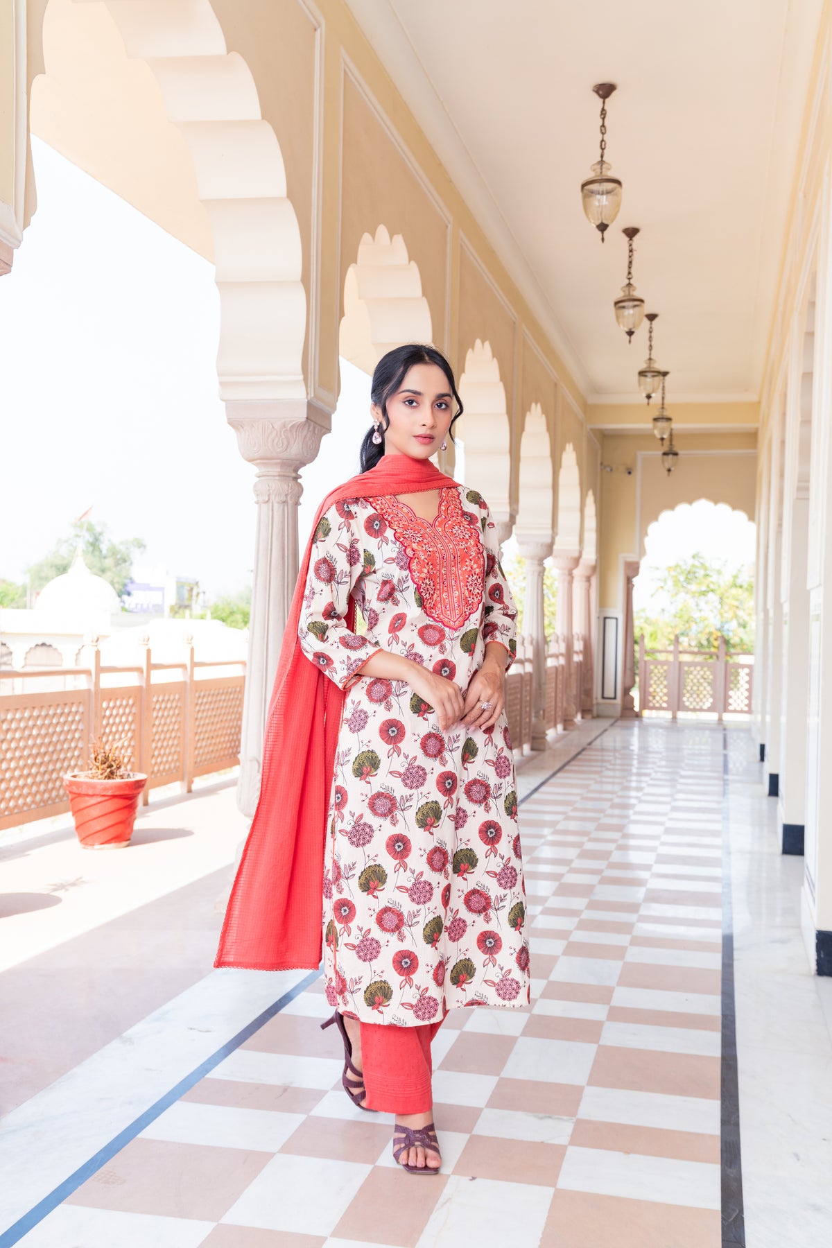 Beige & Red Cotton Embroidered Kurta Pant Set With Dupatta