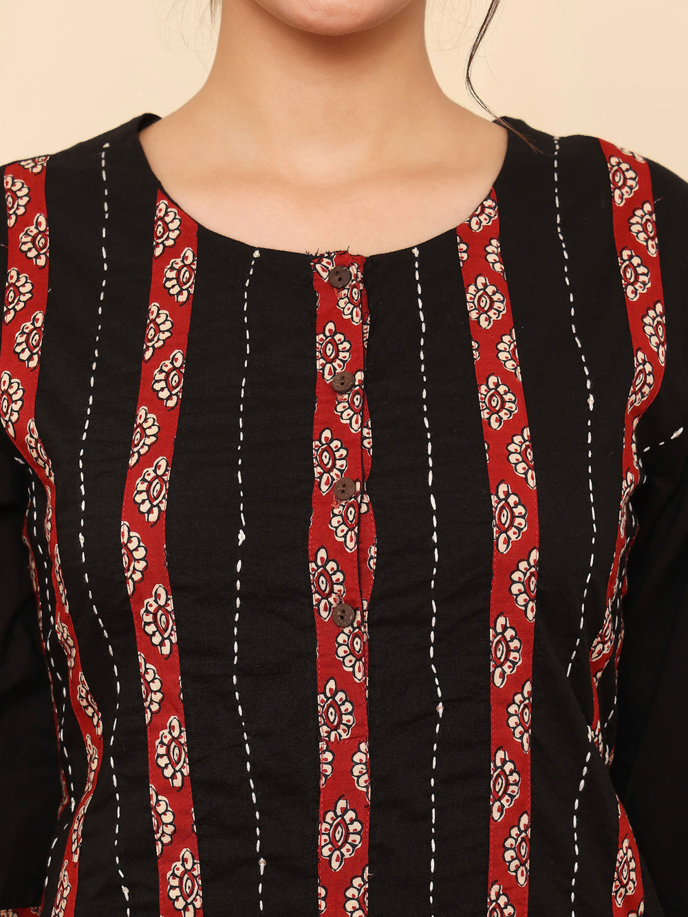 This black cotton kurta combines comfort and style with its straight fit and regular cut. Adorned with intricate Kantha work on the front panel and sleeves, it features a classic round neckline and 3/4 sleeves. Ideal for casual wear, it’s easy to care for with gentle machine wash instructions.