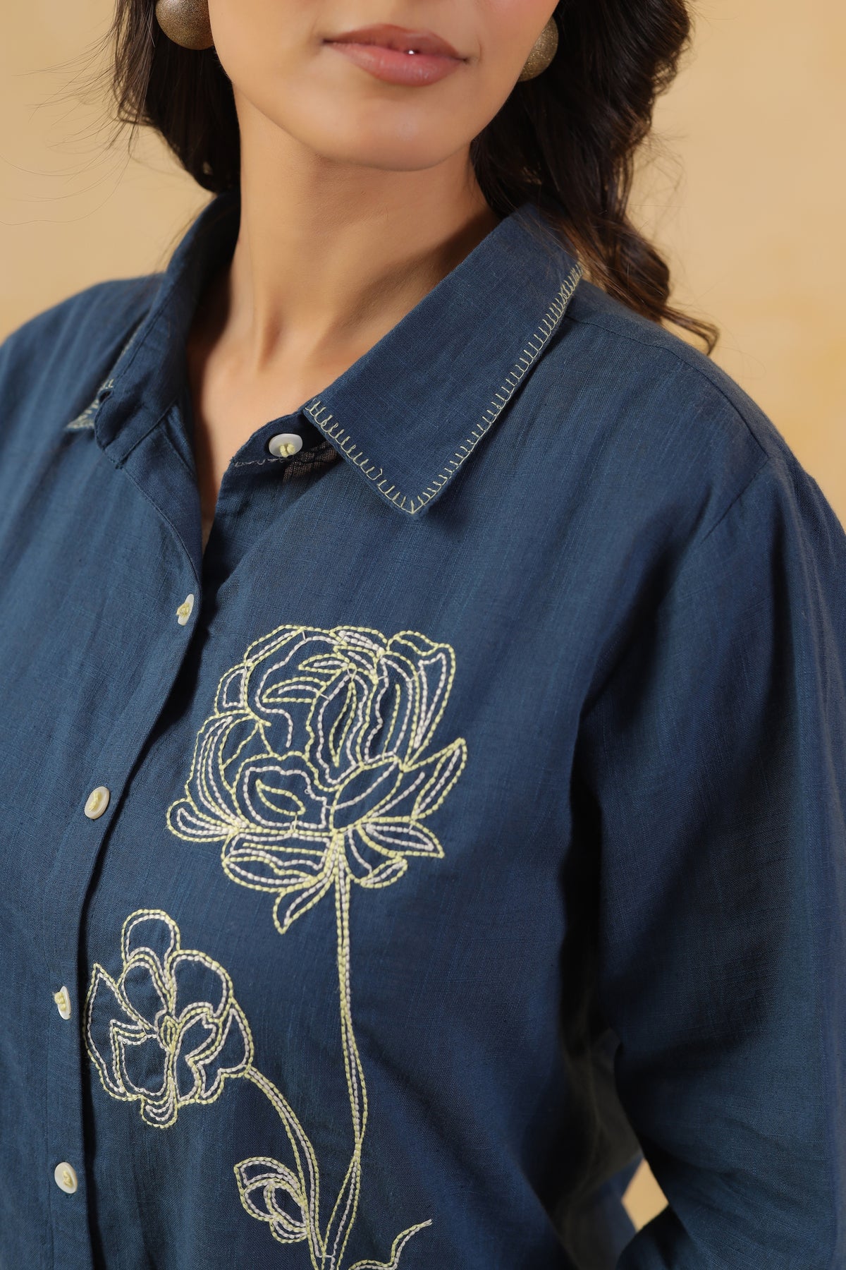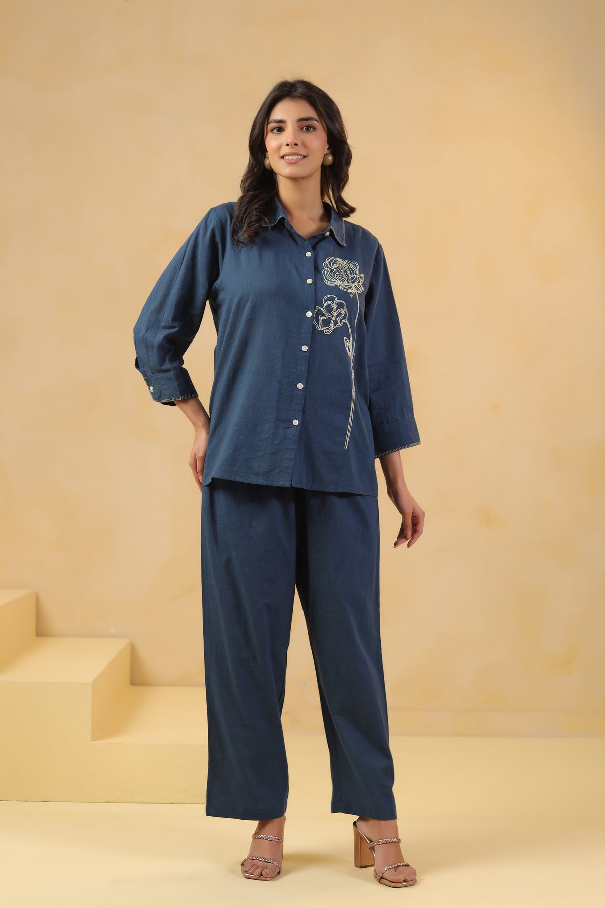 Step into effortless style with this Blue Cotton Embroidery Designer Co-ords Set. The hip-length top features a smart shirt collar, 3/4 cuffed sleeves, and front button closure, highlighted with elegant embroidery on the front and delicate thread work on the collar and sleeves. Paired with matching blue pants designed with an elastic waistband and two side pockets, this set offers both comfort and functionality. Perfect for casual wear and office wear, it blends sophistication with everyday ease.
