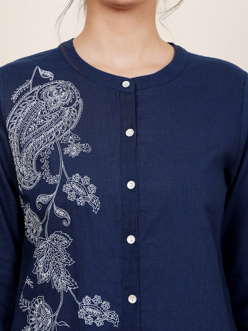 Discover elegance with our Blue Cotton Printed A-Line Kurta, thoughtfully designed for style and comfort.