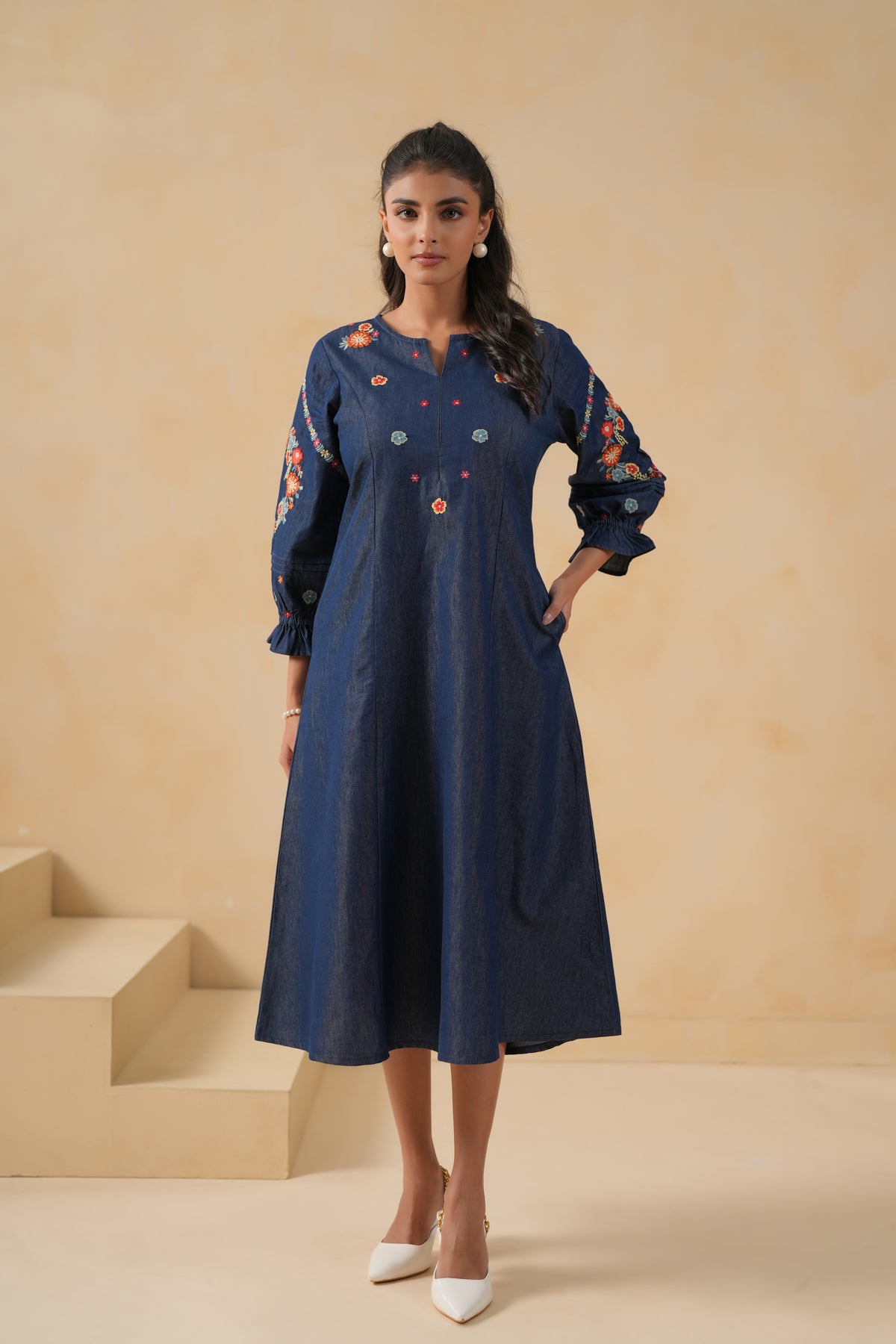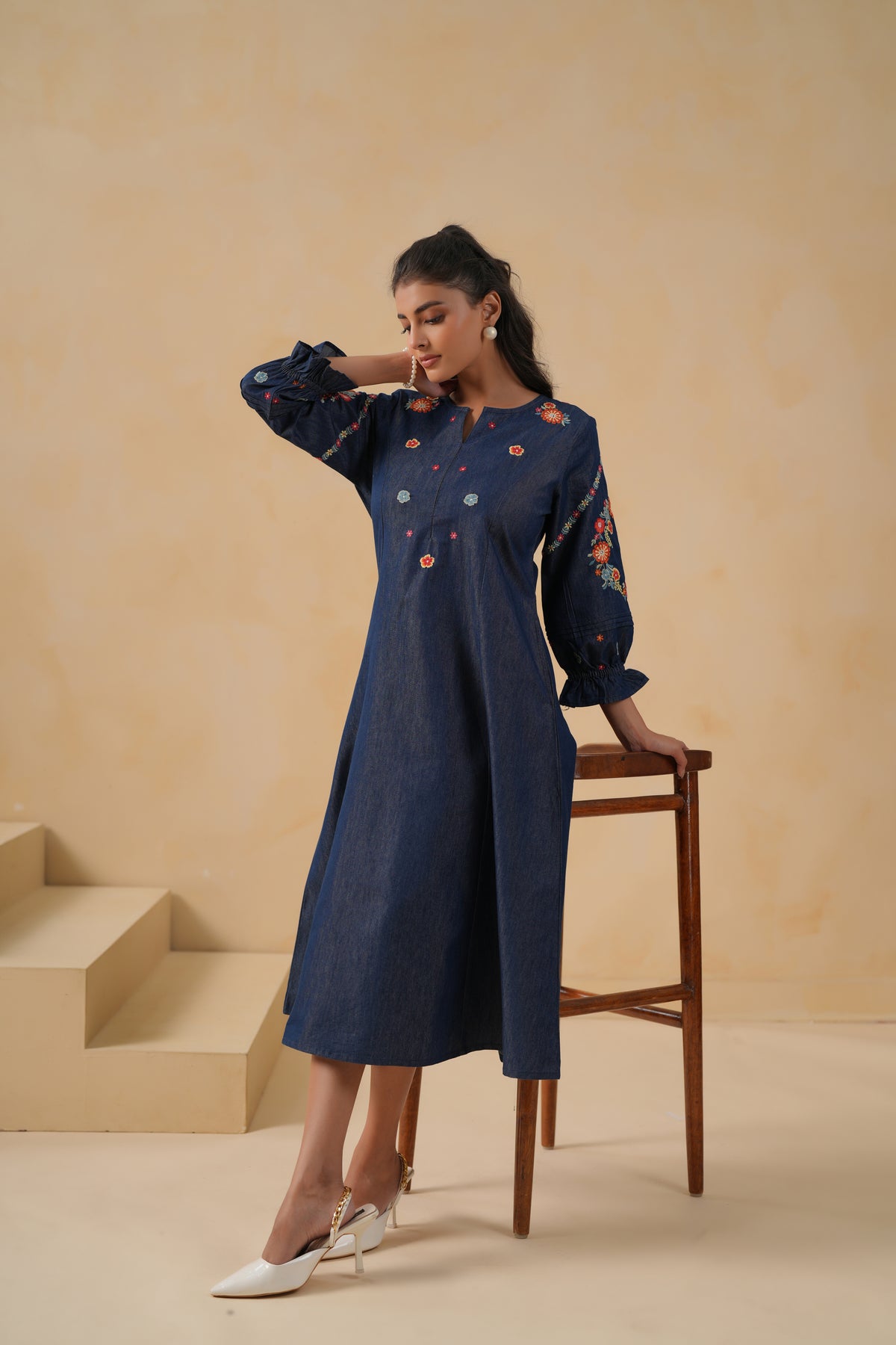 Elevate your festive style with this Blue Denim Embroidered A-line Designer Kurta, featuring elegant embroidery on the yoke, sleeves, and back. Designed with a flattering V-neck, 3/4 bishop sleeves with pintuck detailing, and a graceful calf-length silhouette, this kurta offers a perfect blend of comfort and charm. Ideal for party wear and family gatherings, it makes a timeless style statement.