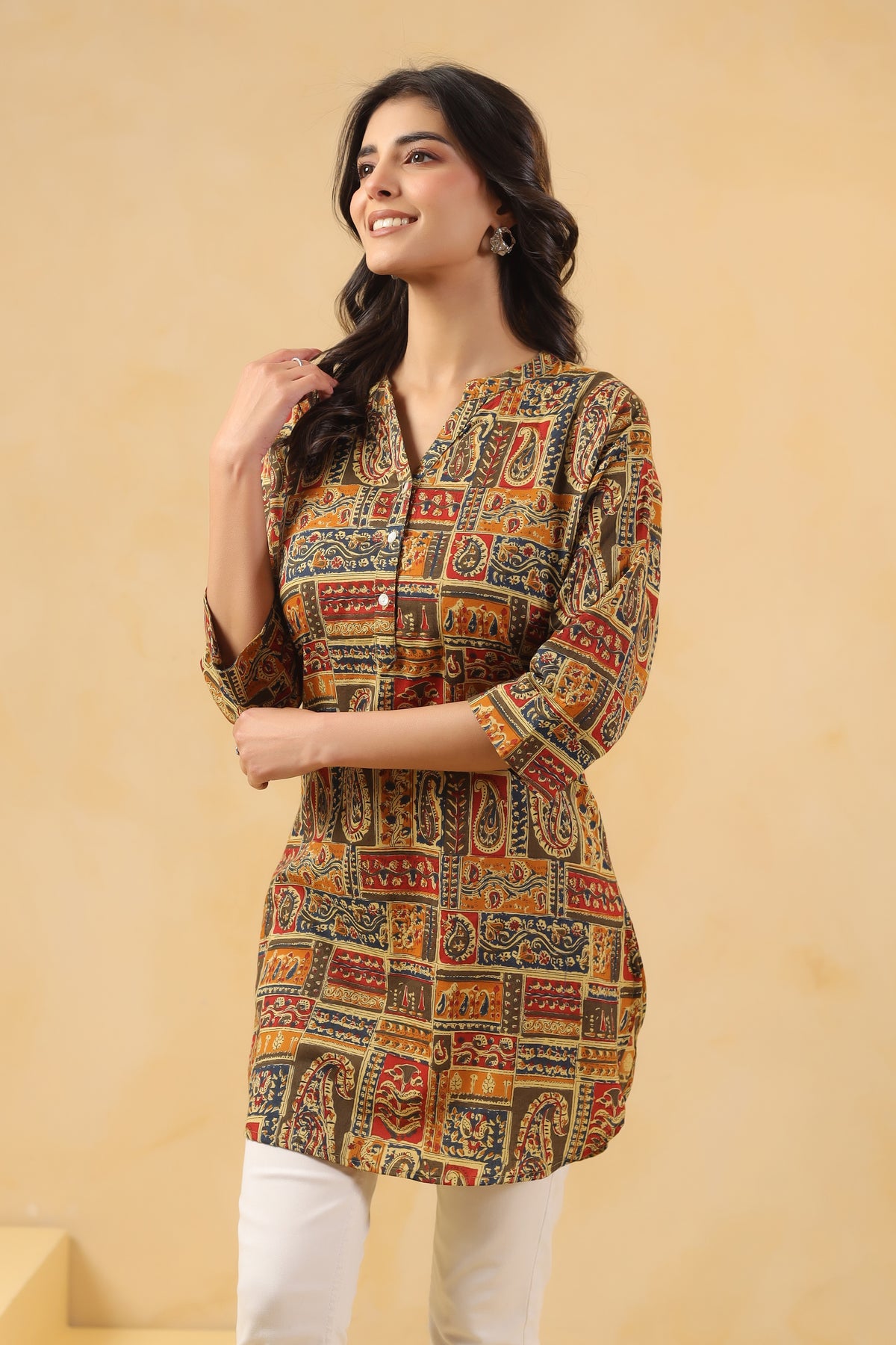 Brighten up your everyday wardrobe with this Multicolor Cotton Printed Straight Top, crafted from soft and breathable cotton for all-day comfort. Showcasing an elegant paisley print, the top features a mandarin neck and 3/4 cuffed sleeves for a refined look. The front button closure on the yoke adds a stylish touch, while side slits ensure ease of movement. Perfect for casual and daily wear, this versatile top blends comfort with effortless style.