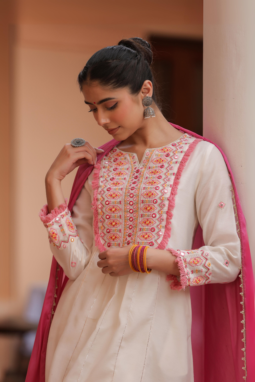 Elevate your style with our Off White Cotton Embellished Sharara Set. The flared kurta, made with premium cotton, features heavy embroidery, mirror work, and lace details on the yoke and sleeves. Perfect for festive occasions, this set exudes a sophisticated and exclusive charm.