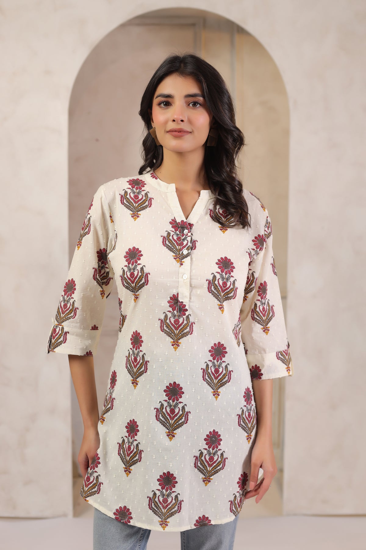 Add effortless charm to your everyday look with this Off White Cotton Printed Straight Top, crafted from soft and breathable cotton. Featuring a graceful floral print, the top is designed with a mandarin neck and 3/4 cuffed sleeves for a smart, polished touch. The front button closure on the yoke enhances its style, while side slits, a box pleat at the back, and a trendy high-low hem offer comfort and movement. Perfect for daily wear and casual outings, this versatile top blends elegance with ease.