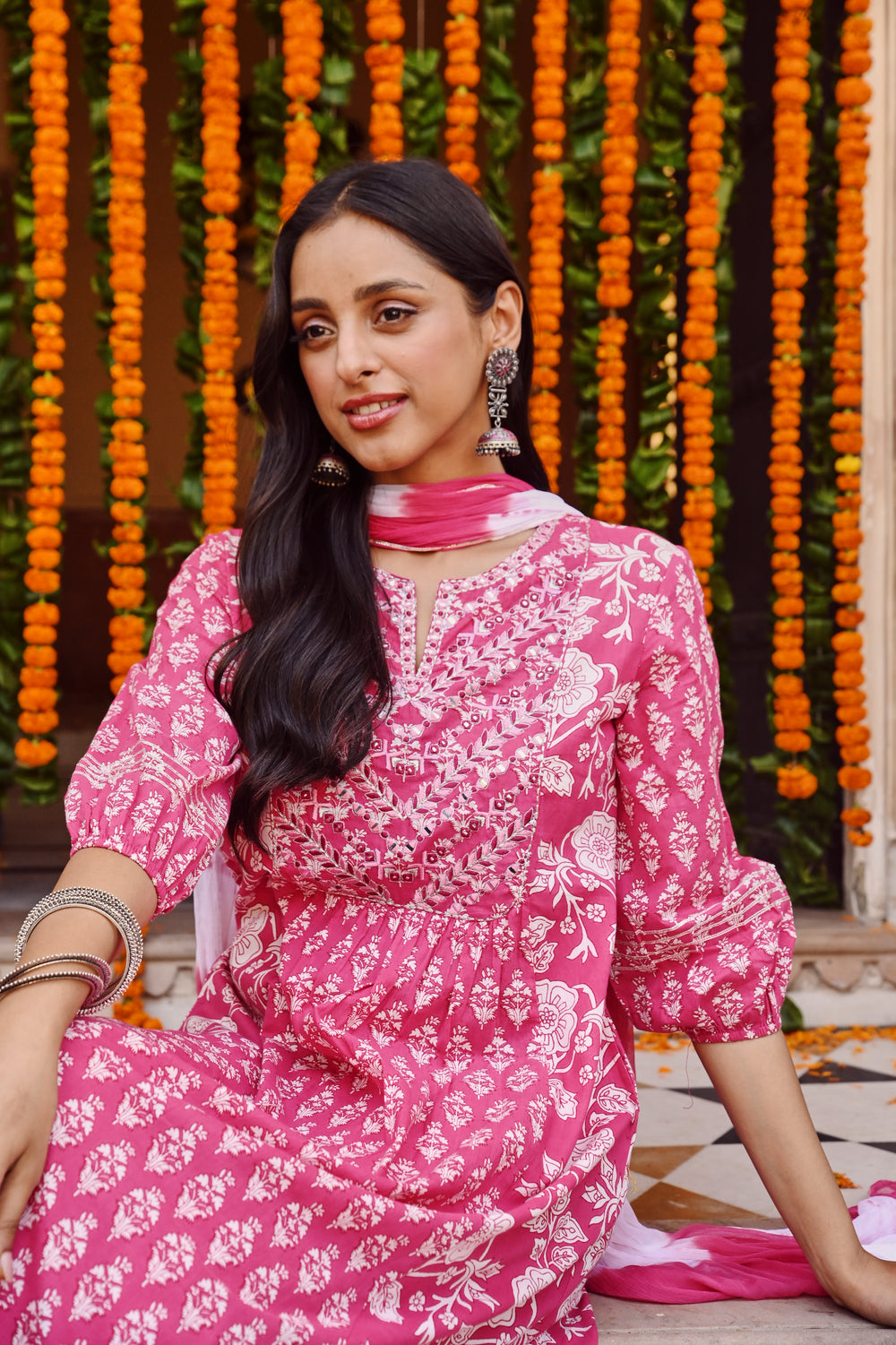 Indulge in luxury with our Pink Cotton Embroidered A Line Suit Set. Made with high-quality cotton, this suit set features exquisite resham and Zari embroidery on the placket, adorned with delicate mirror work. The semi elasticated sleeves and straight trouser pant provide comfort and the Nazneen dupatta adds a touch of elegance. Perfect for any semi-festive occasion.