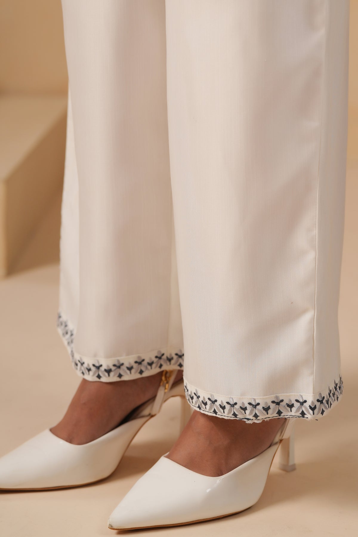 Elevate your style with this elegant Poly Silk White Embroidered Designer Kurta Pant Set. The kurta features intricate embroidery on the front panel and sleeves, complemented by a classic shirt collar and 3/4 regular sleeves. Designed with an above-knee length, it pairs beautifully with matching pants that have a semi-elastic waistband and delicate embroidery detailing. Perfect for family functions, evening outings, and office wear, this ensemble blends sophistication with comfort.