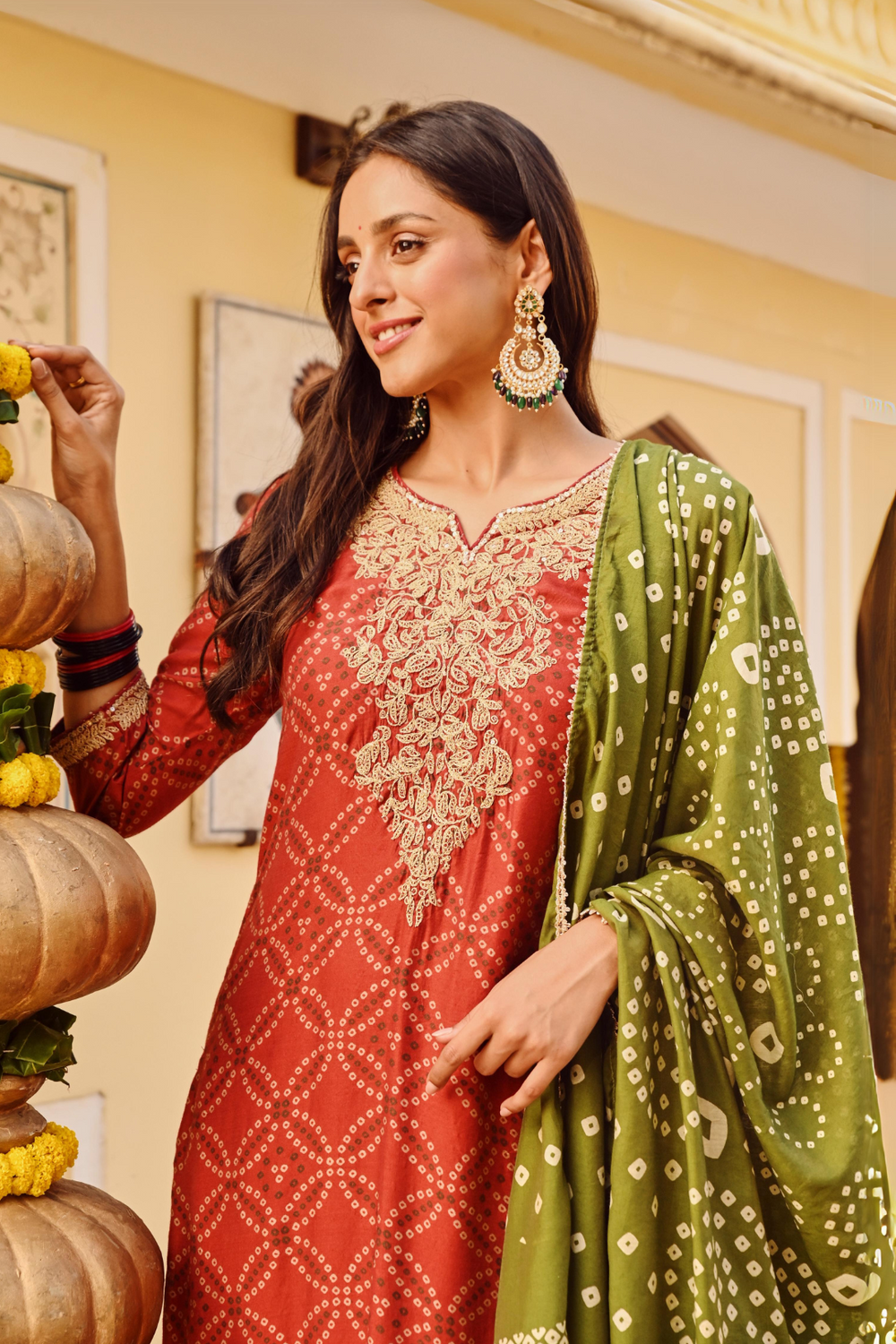 This elegant set features a straight-fit kurta made of Chanderi fabric in a vibrant red hue. Adorned with Bandhani patterns, the kurta showcases intricate Zari embroidery & sequin work on the yoke and sleeves, along with Zari detailing on the slits. The accompanying dupatta is enhanced with lace borders, and the pant hemline also features lace accents. The kurta has a sweetheart neckline and 3/4 sleeves, making it a perfect choice for festive occasions.