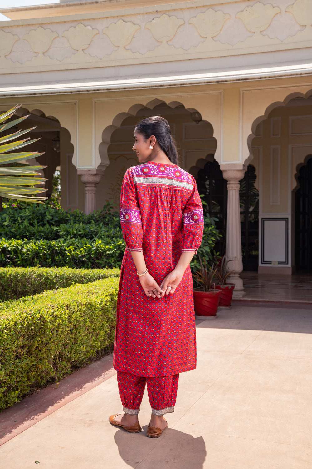 Red Cotton Printed Designer A-Line Kurta Pant Set