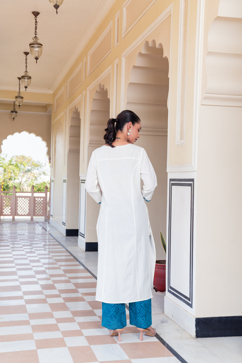 Refresh your ethnic wardrobe with this graceful three-piece kurta set crafted in soft cotton. The white straight kurta features a round neck with 3/4 regular sleeves, highlighted by elegant blue embroidery on the yoke and sleeves for a refined touch.