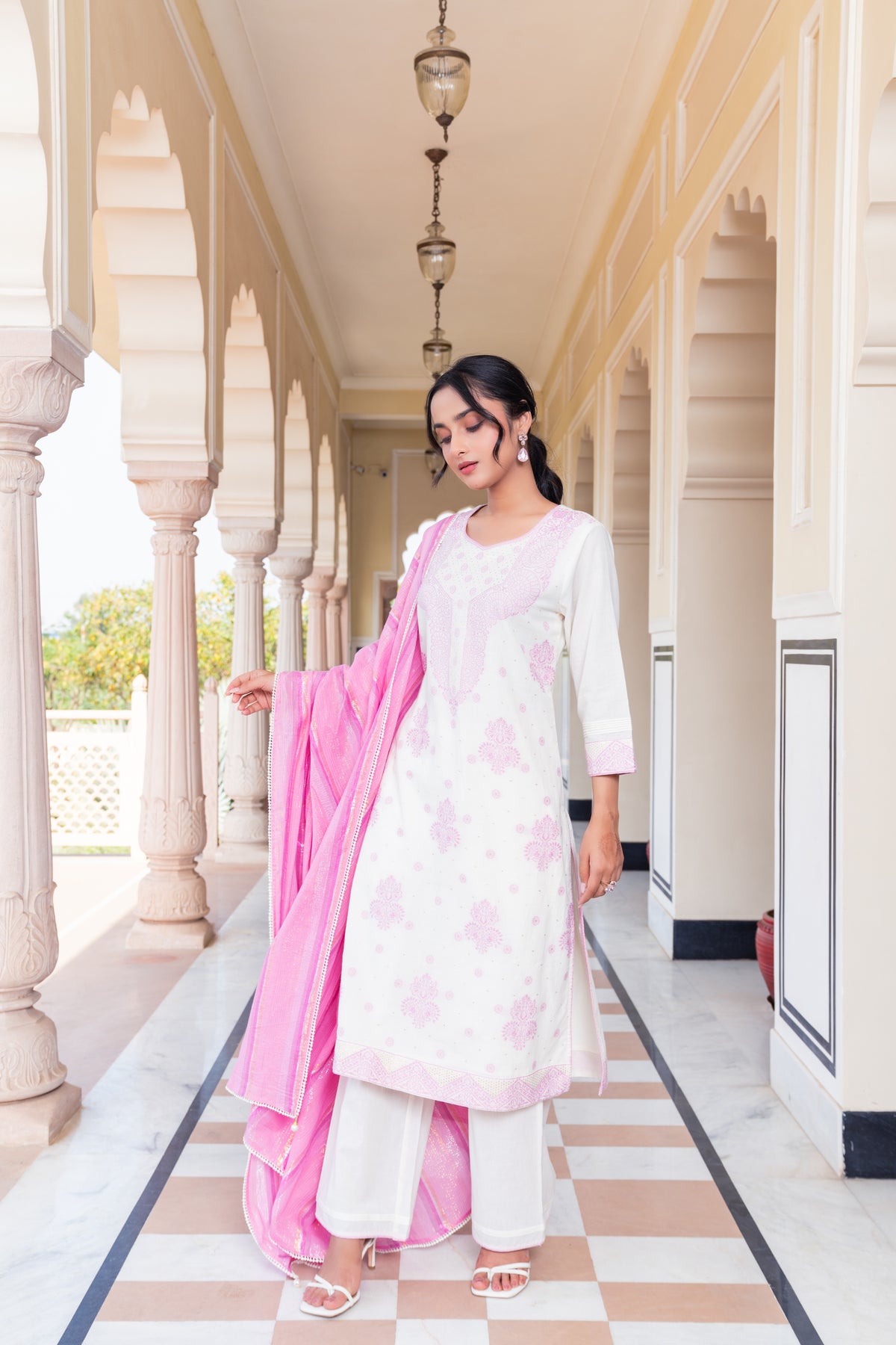 White & Pink Cotton Yarn dyed Kurta Pant With Dupatta