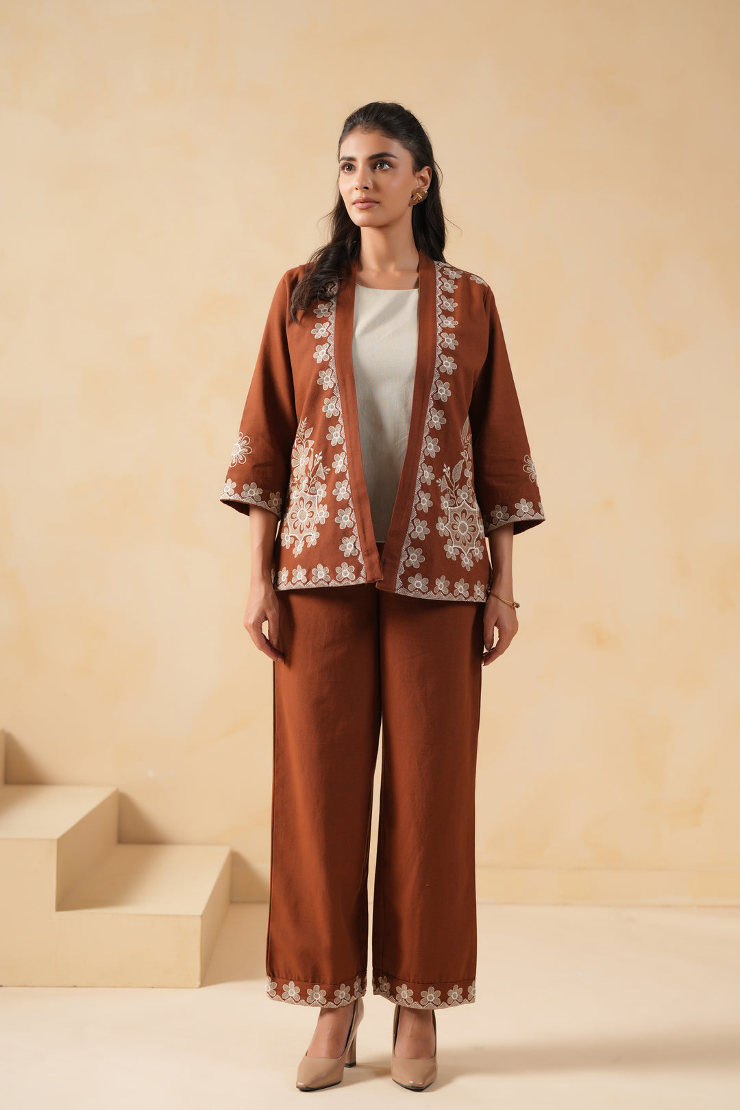 Brown Cotton Embroidered Designer Co-Ord Set