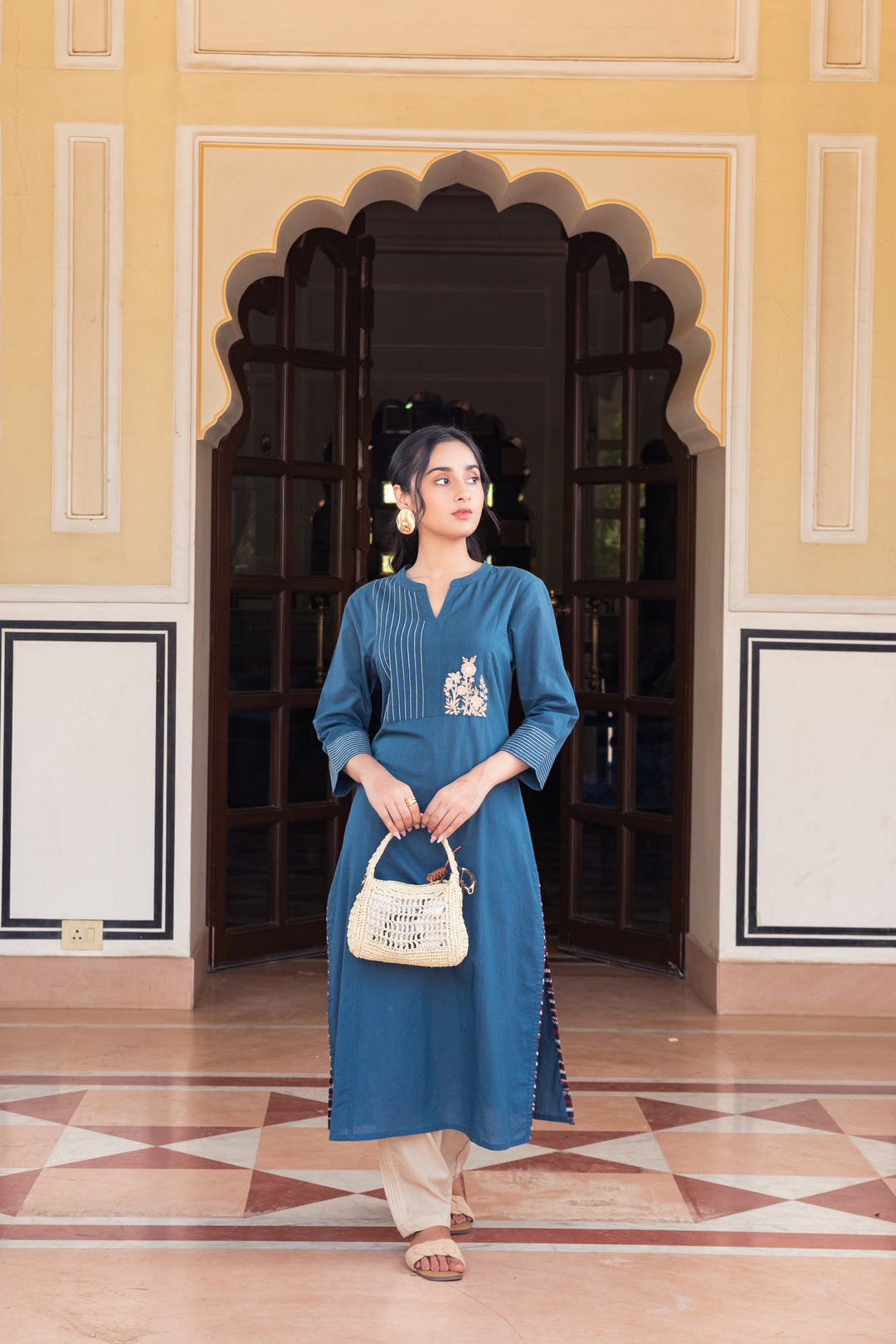 Blue Cotton Embroidered Straight Kurta Pant Set