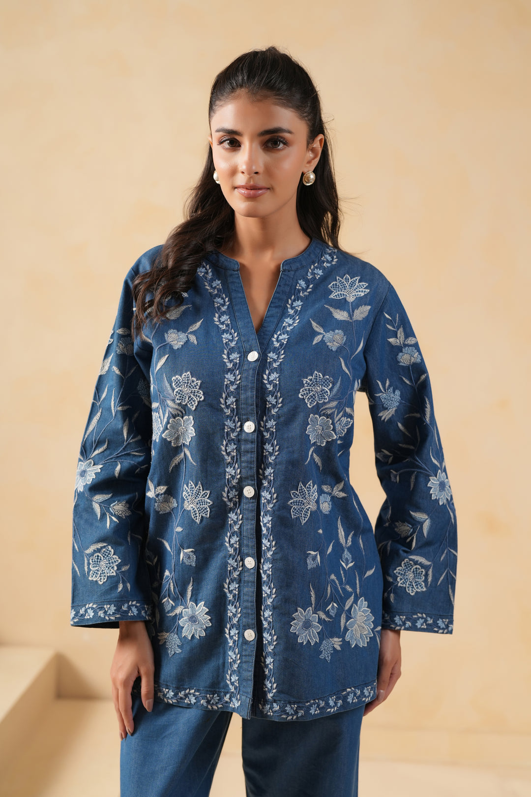 Denim Dark Blue Embroidered Mandarin Collar Top