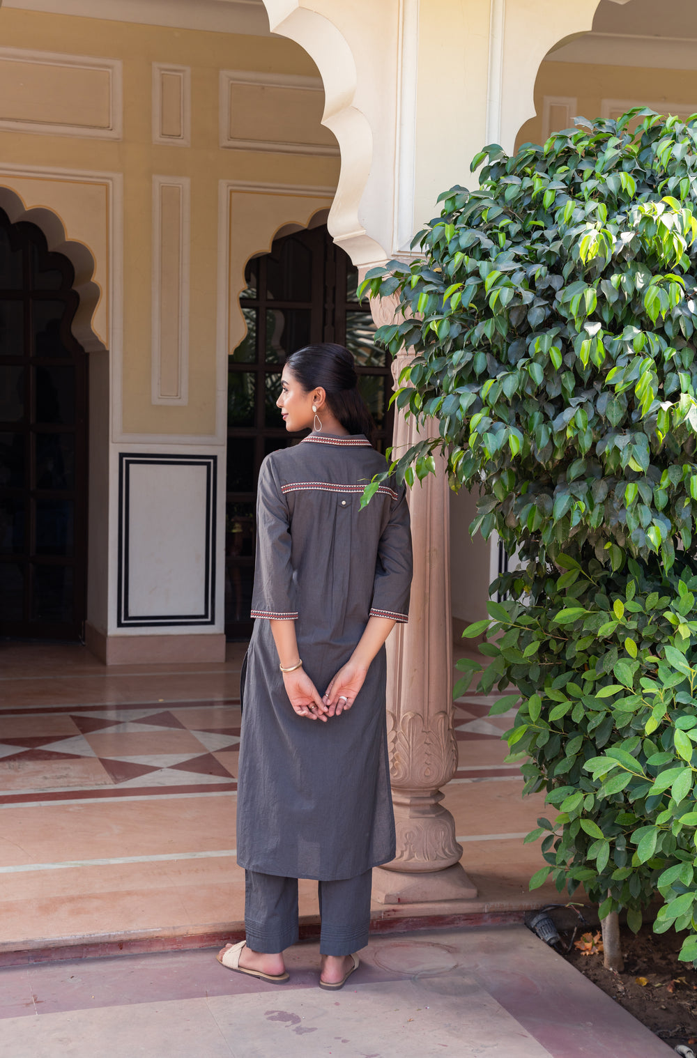 Grey Cotton Embroidered Designer Straight Kurta Pant Set