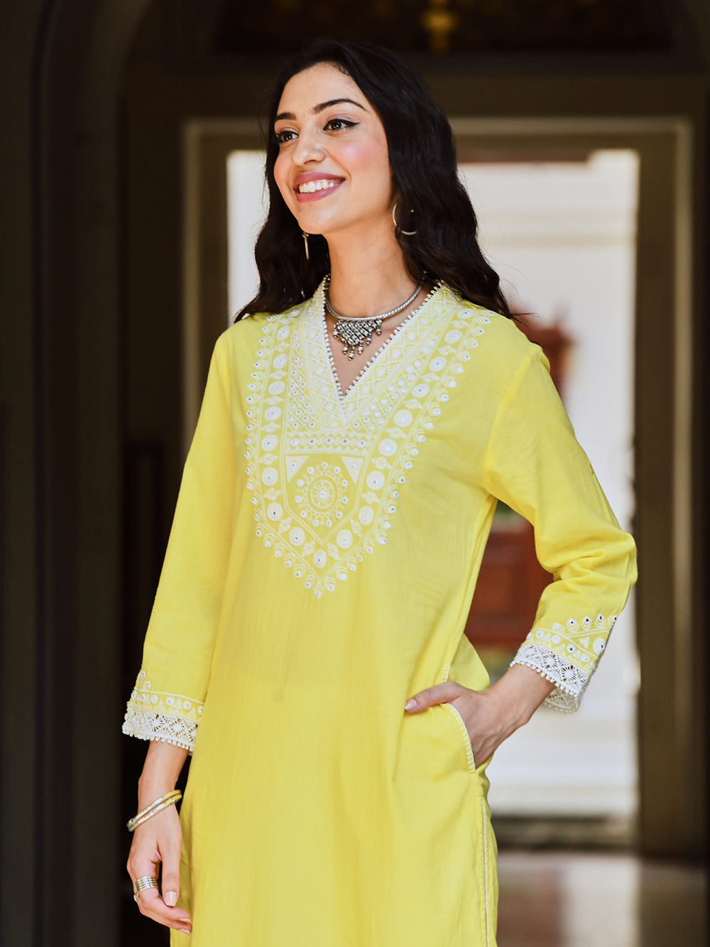 Melon yellow for the win! This cotton Kurta by Savi features a V-neckline and a straight silhouette. The special detailing on the women’s Kurta includes lace detailing, thread embroidery and mirror work! As for the piping on the side slit, it is testimony to Team Savi’s skill for crafting clothes. Buy now.