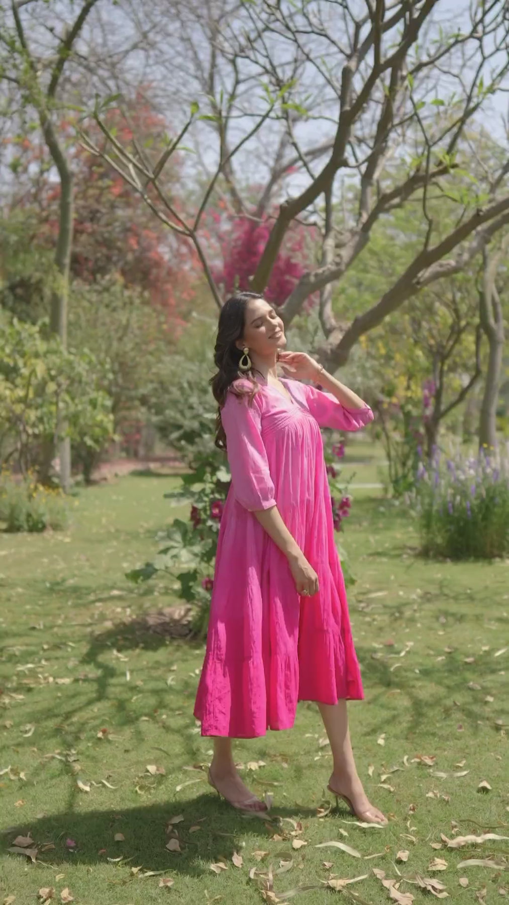 Indulge in the ultimate luxury of our Pink Cotton Dobby Ombre Tiered Designer Dress. This dress boasts a V-neck and 3/4th sleeves, adorned with intricate Kantha detailing on the neck, sleeves, and yoke. Its cotton voile lining and lightweight material make it perfect for a breezy summer look, whether it be for the office or a casual outing. Elevate your style with this exclusive, designer dress.